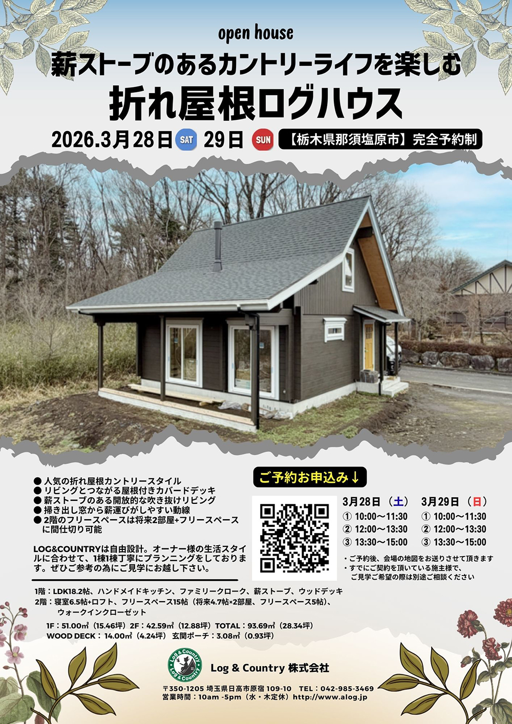 詳細開催日 2026年 3月14日(土)・ 15日(日) (予約制) 開催時間 ➀ 10:00~12:30 ➁ 13:30~16:00 開催場所 Log & Country 社屋(埼玉県日高市) -